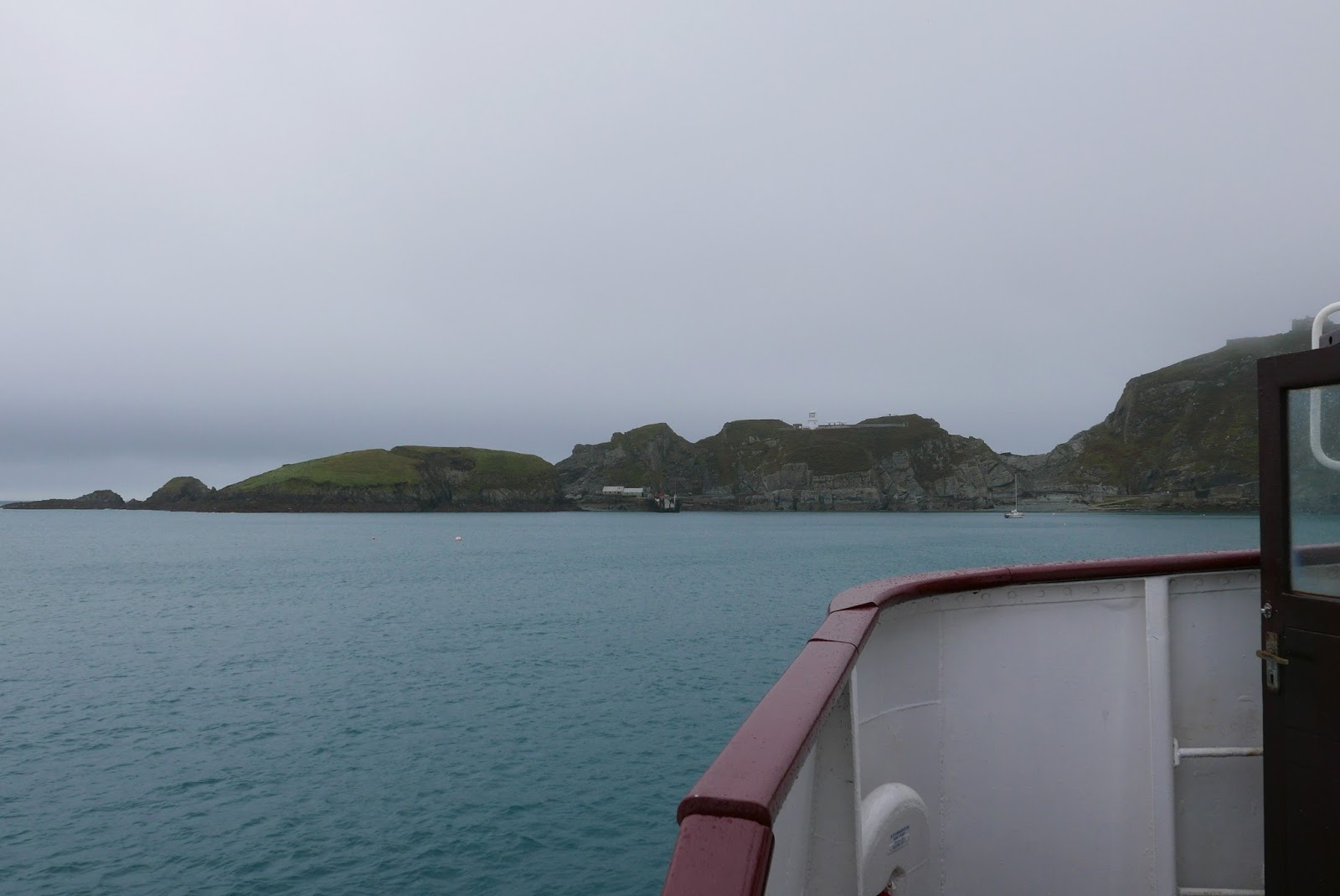 The rain had stopped. It wasn't exactly bright and breezy (it was still dull and blustery) but the wind was invigorating. I forgot that I felt uncomfortable. I could see now why people had stayed up here, rather than risk chundering below. The cold wind would have kept queasiness in check. Oh, and look! The island was getting close.