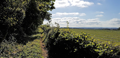 At first the path kept out in the open, after a while it switched to a route just inside the wood, without a sunny view. I felt enclosed by the wood, and had a mile of this ahead. It definitely felt creepy. Once again, I questioned my wisdom in walking alone in such isolated places. What would I really do, if some man approached, especially if he looked in any way odd or shifty? Old chaps with serious backpacking gear, pukka ornithologists with binoculars, and official-looking farm or forestry workers in credible overalls or some sort of uniform were one thing; sly characters with ferret eyes quite another. My stick didn't feel all that reassuring. Then the bright sunlit world beyond the wood came into view. Great relief!