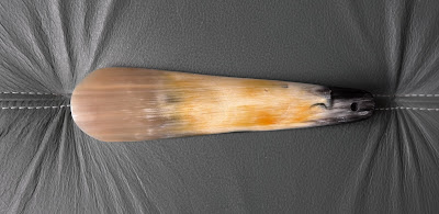 Back home, I unpacked it and inspected it more closely. I hadn't been diddled. It really was cut and shaped from a piece of natural horn. Its surface was smooth and polished, but with little bumps and some pitting, which I don't think would have been present if just a moulded plastic shoe horn. It was slightly translucent, as I could see by holding it against a light.